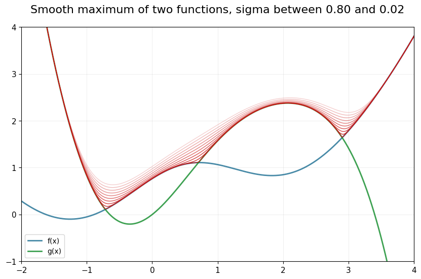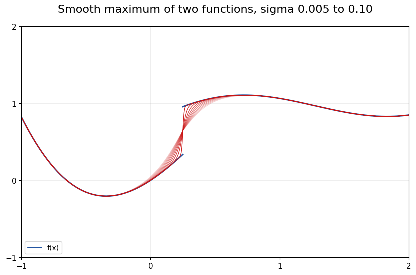 Consider two functions \(f(x)\) and \(g(x)\) defined over some range \(X\). Imagine we are interested in \(h(x) = \max\big(f(x), g(x)\big)\), which has kinks in general case at the point where it holds \(f(x)=g(x)\).